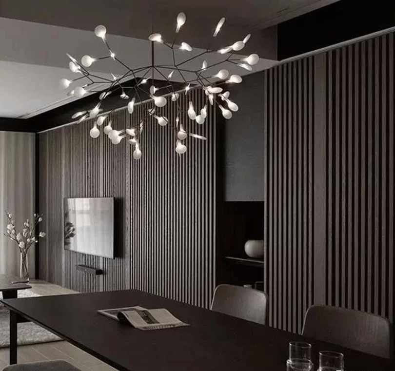 整塊的木飾面背景墻同樣會顯單調,與其他材質進行組合就能讓美觀度更上一個臺階。