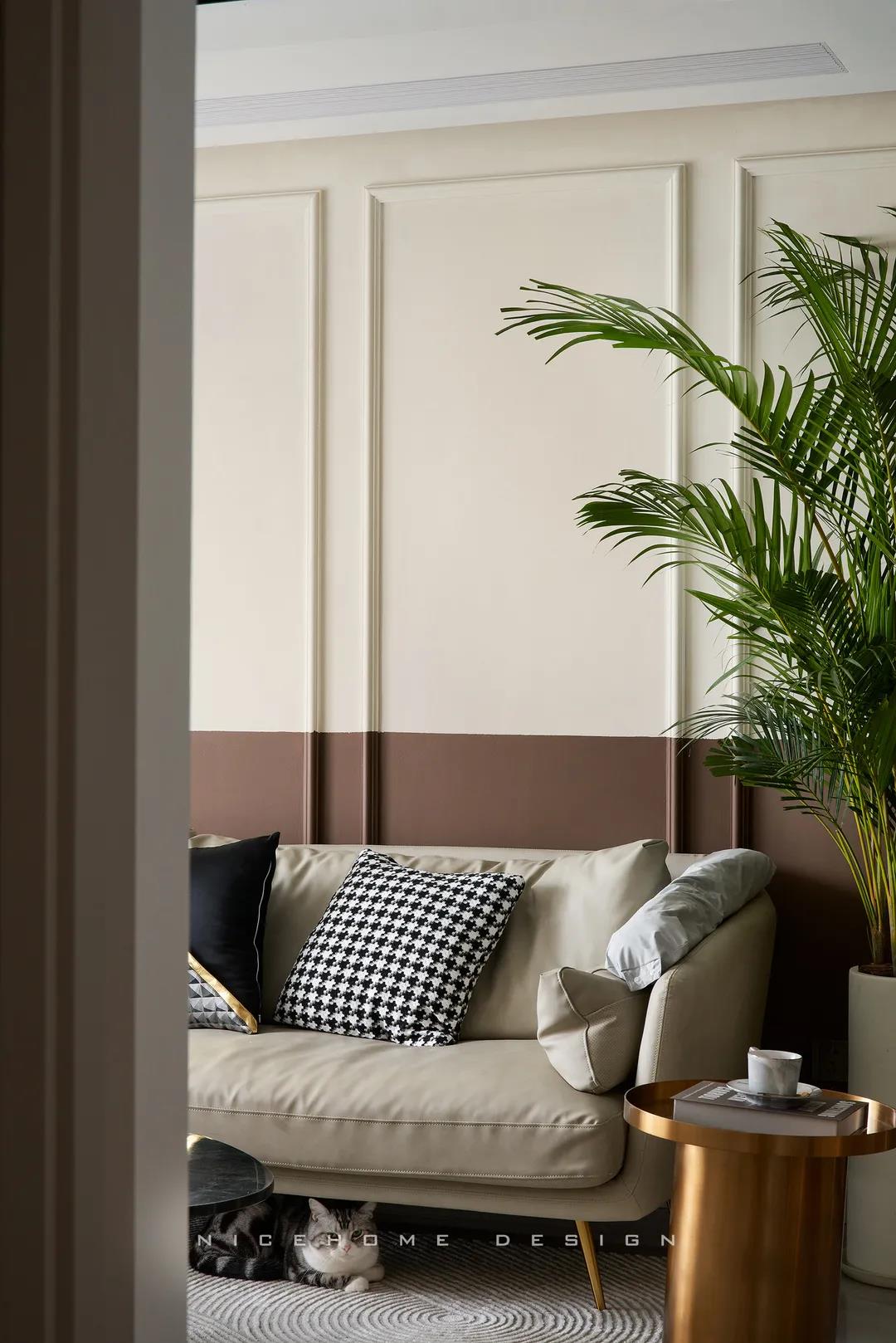 顏色可以直觀體現屋主的喜好。上淺下深的半墻設計佐配石膏線,散發出濃郁的復古情調,彰顯著主人的生活品味。