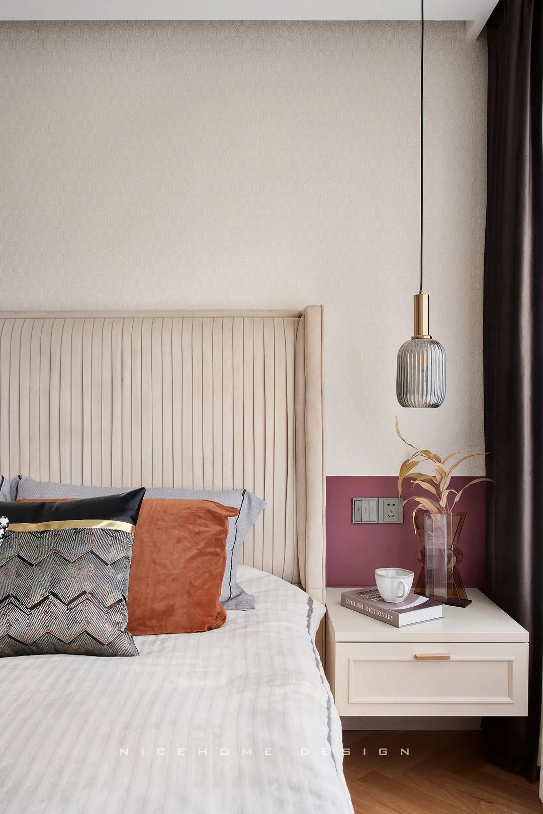 主臥房的采光極好,陽光灑進屋子,整個就像被和煦的光輝浸泡著,恬靜溫暖。背景墻用墻紙與乳膠漆結合,優雅的紫紅色向我們透露著一位成熟女性的美麗端莊。