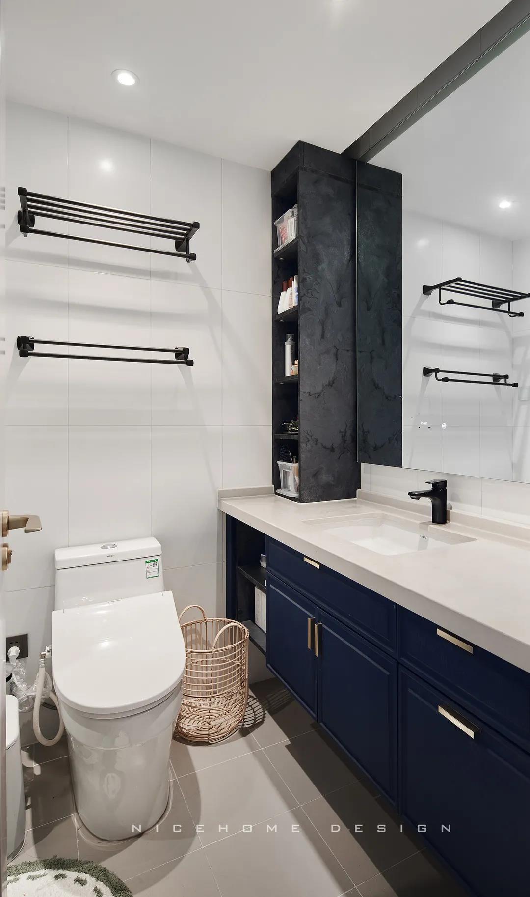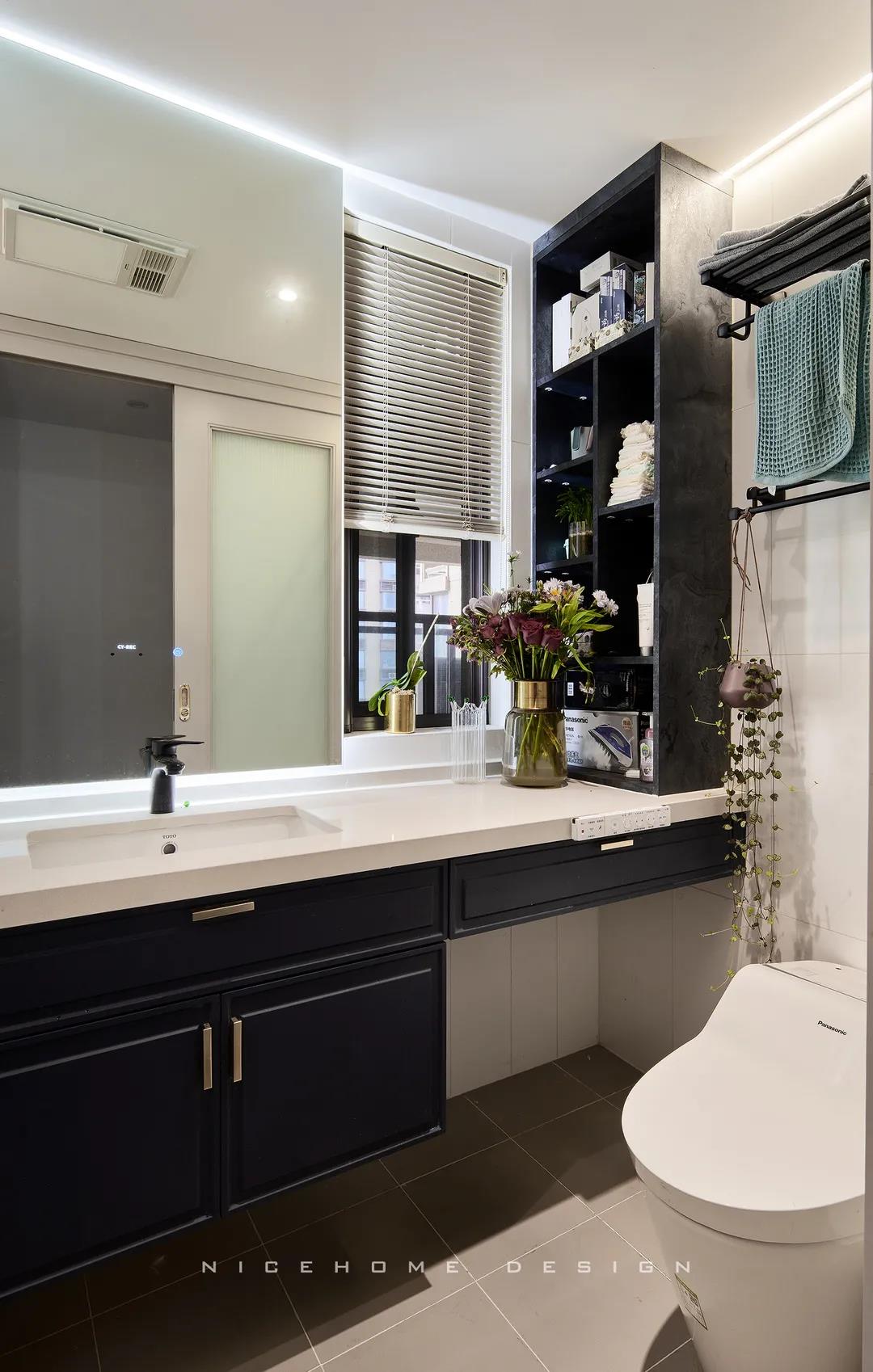 兩個衛生間風格一致,深淺色的搭配讓這里既干凈明朗,又具備時髦氣質。角落里擺放花卉和綠植,默默傳達著女主人對這個家,對生活的滿滿熱愛~