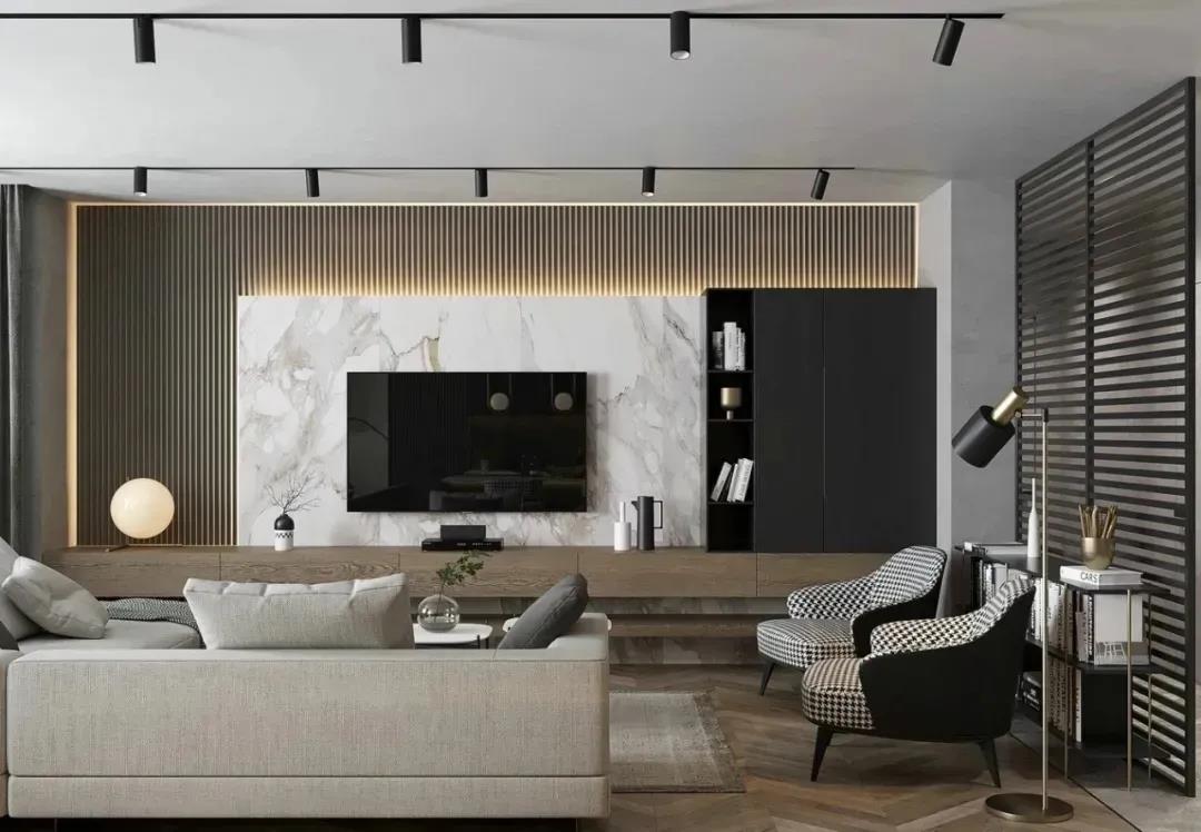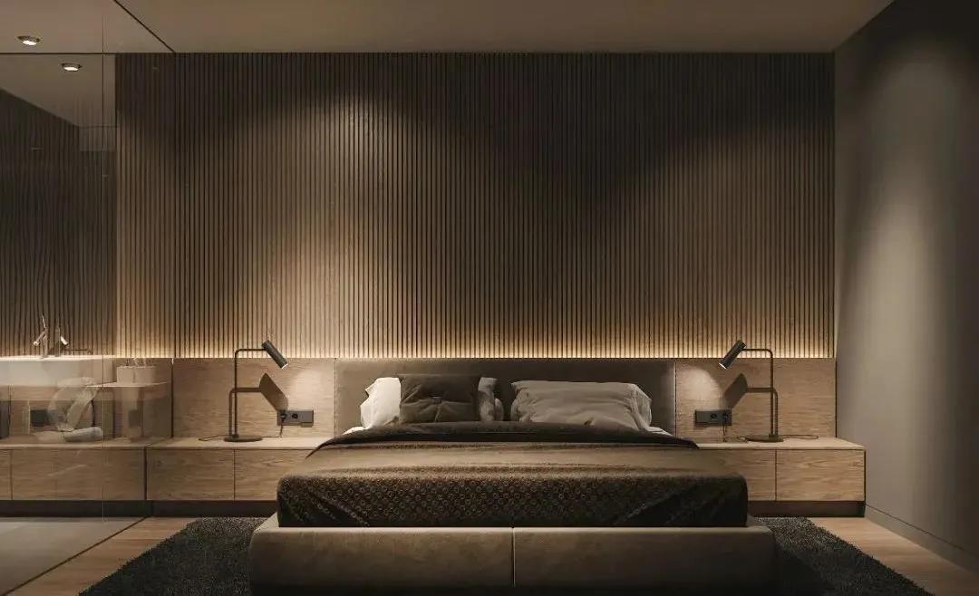 除隔斷之外,木格柵應(yīng)用于各空間的背景墻也是常見的做法,比如客廳、臥室等。