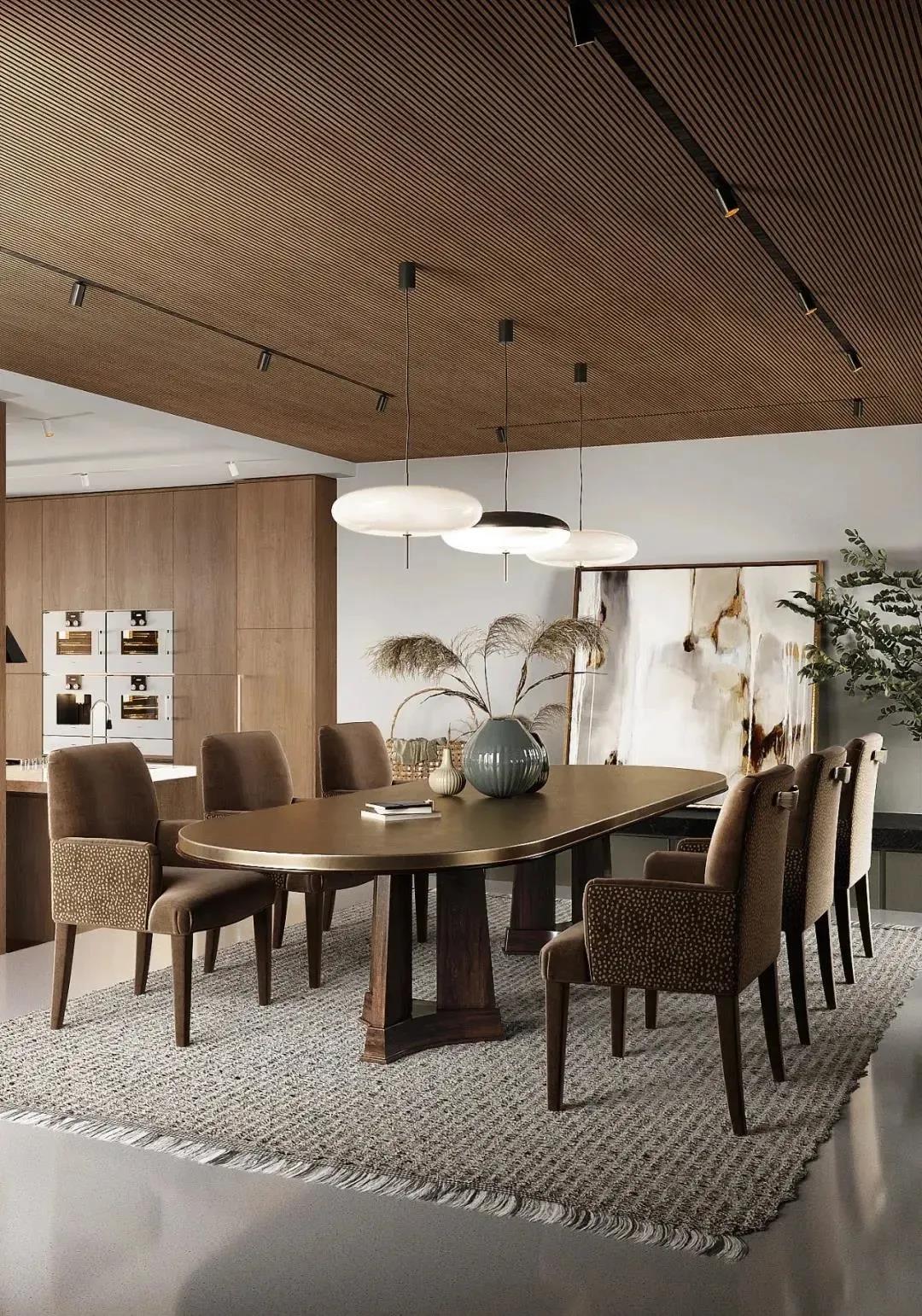 如果想進(jìn)一步提升裝飾效果,可將線性光源穿插在木格柵之中,讓空間能在光影中盡顯朦朧雅韻~