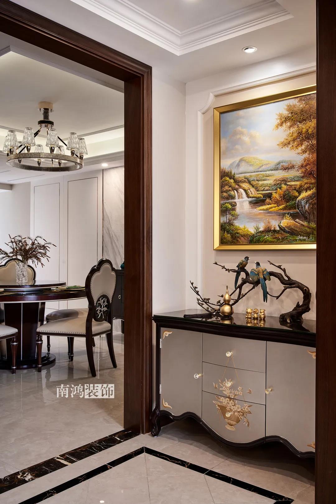 正對入戶口的玄關走道,盡頭處用矮柜輔以金框風景畫和擺件打造端景,實現高雅藝術表達。