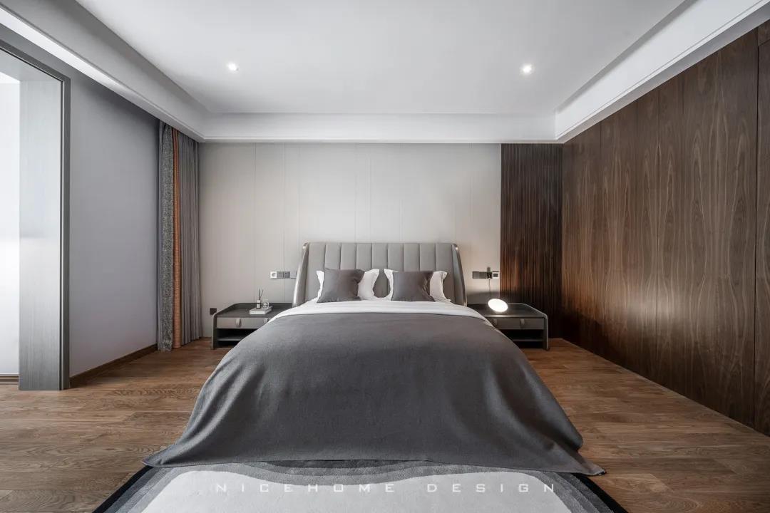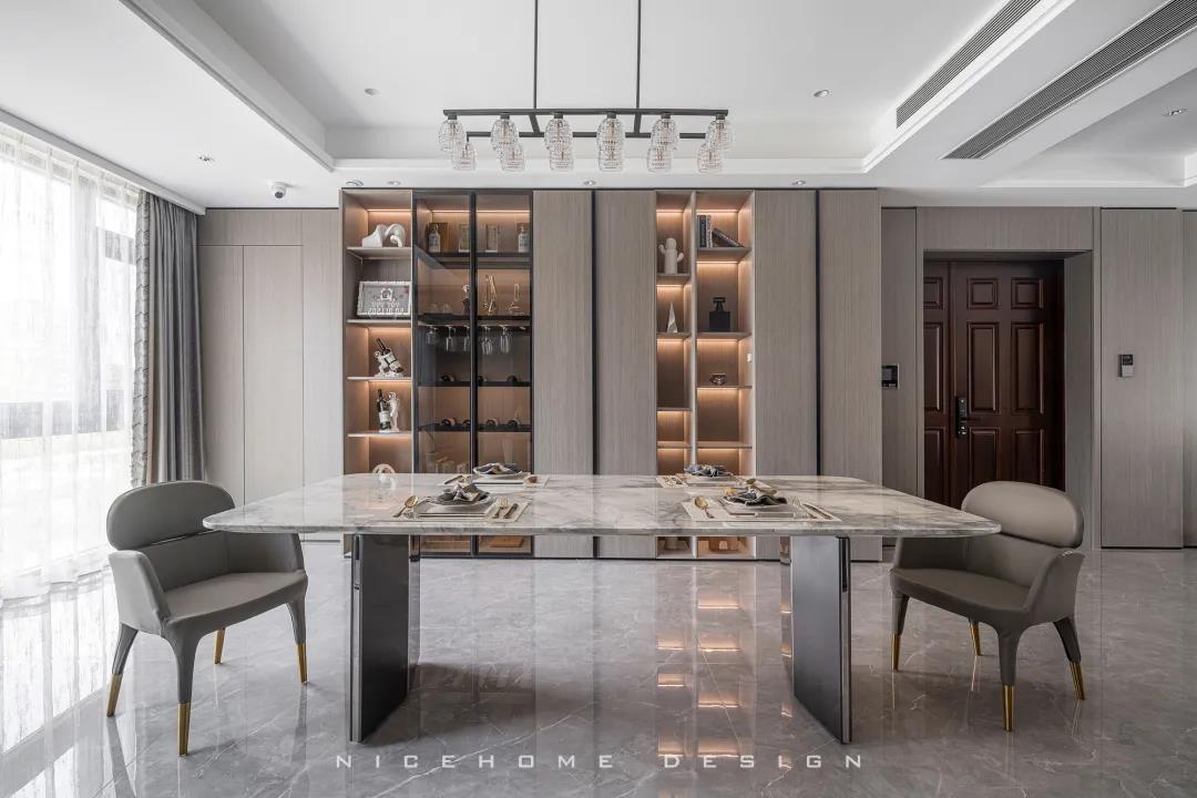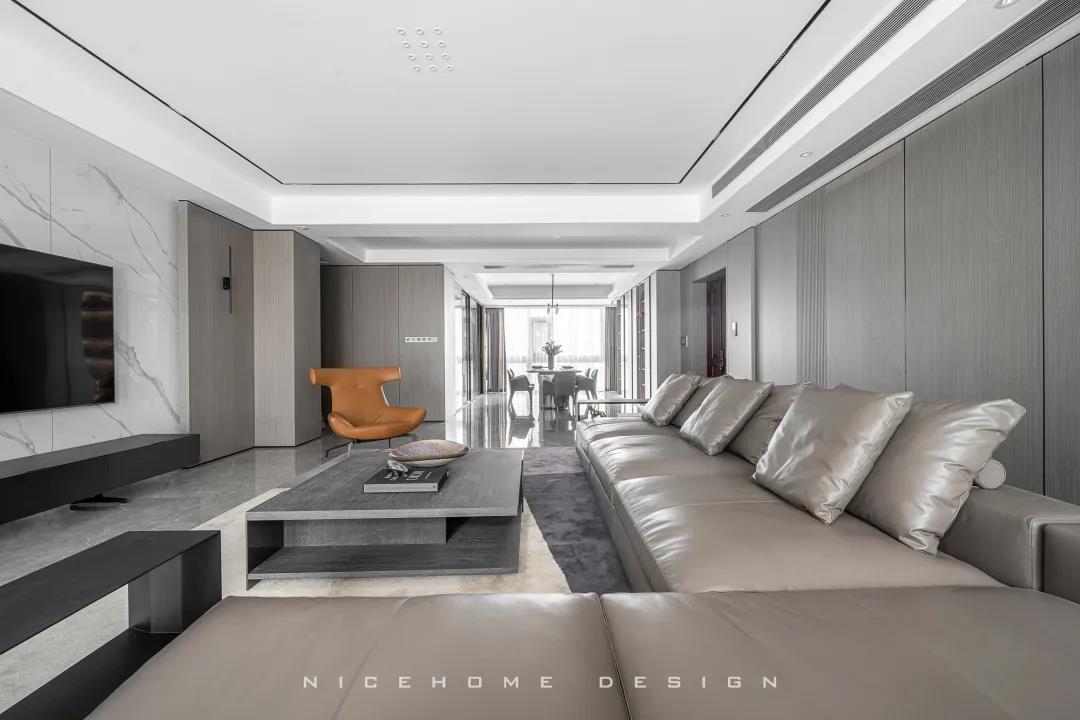 關于家的氛圍感營造,色彩和燈光是至關重要的兩點。 現代風格的色彩設計受現代繪畫流派思潮影響很大,通過強調原色之間的對比協調來追求一種具有普遍意義的永恒的藝術主題,裝飾畫、飾品的選擇對于整個色彩效果則起到錦上添花的作用。 除了色彩上的和諧配比,設計師在本案燈光設計上也下了許多功夫,重點突出:一是燈光功能布局的細化,照明燈光、背景燈光和藝術燈光三種效果有機組合;二是燈光控制的智能化、模式化,也即控制方式由分開的開關變為集中遙控,通過設定視聽、會客、餐飲、學習、睡眠等組合燈光模式,來達到理想效果。 客廳 LIVING ROOM 客廳包進陽臺,最大限度引入外部光線,呈現明亮通透的視覺效果。對于主人而言,室內的隱私也相當重要,因此在陽臺口安上了窗簾。 空間布局開敞,沙發后留出距離讓公區域動線更加流暢。硬裝與家具的線條都十分明晰,簡約的架構創造出清爽有序的居家環境。 質樸的木飾面相比其他材質而言要更加低調,顯露出不張揚的高級感。與之呼應的暖咖色皮藝沙發搭配絨布拼色地毯,和諧的色調、統一的氣質,多種材質交織,賦予空間自然的呼吸與舒緩的心跳。 陽臺一側的立面空間不做絲毫浪費,收納柜中嵌入了洗手臺和直飲水機,視覺上渾然一體。 餐廳 DINING ROOM “是誰來自山川湖海,卻囿于晝夜,廚房與愛。”時尚利落的現代感在餐廳空間鋪展開來,散落于細節間的精致能輕松勾起用餐者的食欲。 餐廳與廚房以長長的玻璃移門相隔,空間視野相當開闊,移門一開,餐廚互動便沒了阻礙。 大理石紋的餐桌組合不銹鋼桌腳,圓角設計勾勒著藝術感知。背景做整墻柜體,除了收納餐具、酒品之外,也方便展示一些個性單品。 廚房 KITCHEN L型布局廚房,有足夠的操作臺讓主人大展廚藝,白色系能將空間寬敞明亮的感覺放大到極致。 過道 CORRIDOR 過道,統一的原木色讓視覺保持極致簡潔,盡頭處的燈光打下來,讓墻上的藝術畫作成功凝固住了剎那間的美好。 臥室 BEDROOM 主臥的陽臺也包進室內,頓時有種面積擴大了兩倍的感覺,更大的面積也意味著更多的活動空間與收納空間。 房間過大容易顯得空蕩蕩的,因此我們在床尾設置了床尾凳和地毯,用以豐富視覺與功能性,頂部依然是簡練的無主燈設計。 睡眠區域簡潔沉穩,高級灰色調與深木色有助于營造安靜而放松的休憩氛圍。 休閑陽臺位置擺放經典的Togo沙發,松松軟軟的坐感簡直不要太舒服! 書房 STUDY 一間高品質的書房背后,必定有著一顆熱愛學習用心工作的靈魂。厚實的桌體組合纖細的桌腳,書桌給人的設計感很強,搭配吊燈和地毯,進一步勾勒出空間的格調與優雅。 休閑室 LEISURE ROOM 家里的休閑室,延續了公區域大面積的灰色質感元素,地臺+懶人沙發+電視,在這里可以自由自在地做自己想做的任何事! 衛生間 BATHROOM 主衛面積富余,在淋浴間和浴缸之外還留出了大量走動空間,再加上雙臺盆設計,力求將舒適度拉到最大。 公衛與次衛,空間分別用灰色與白色的瓷磚統一鋪就,干凈整潔,白凈的基底疊加上黑色線條,看上去會更有品質且視覺不再單一。
