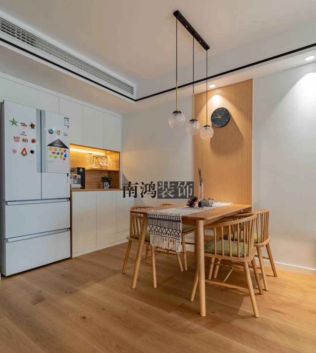 小戶型的餐廳比較適合做嵌入式餐邊柜,利用墻內(nèi)空間來(lái)做收納,能節(jié)約不少面積。