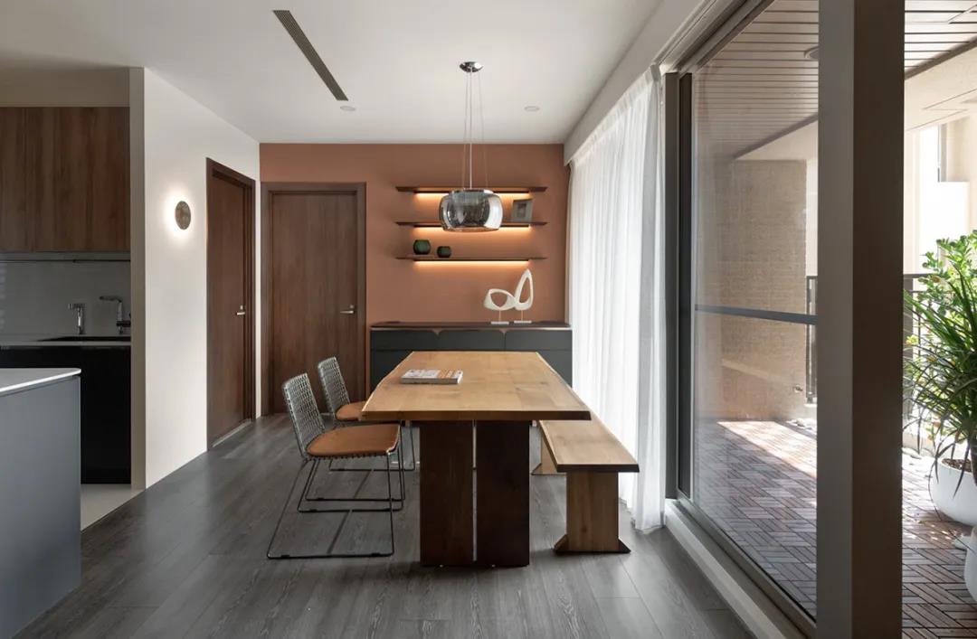 將吧臺(tái)與餐桌結(jié)合的設(shè)計(jì)相當(dāng)美觀,無(wú)論是就餐還是品酒,都讓生活充滿了情調(diào),適合單身或是兩個(gè)人住的家庭。