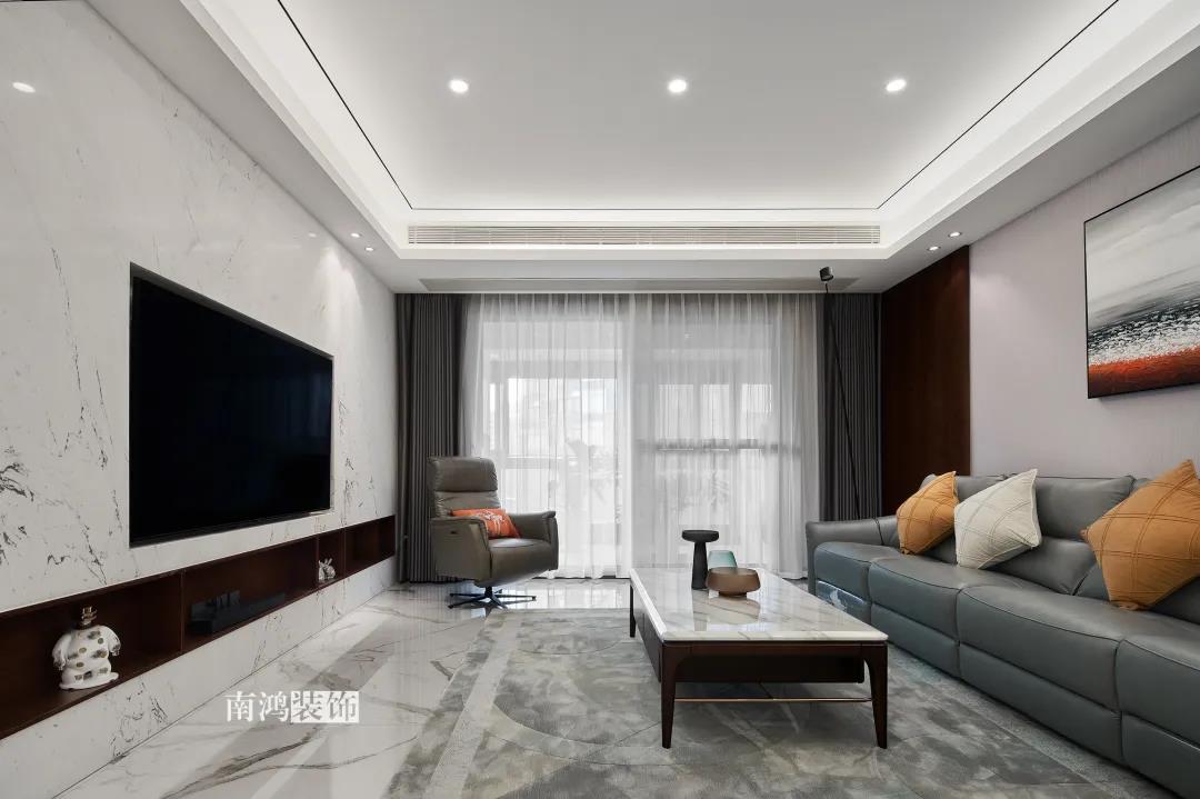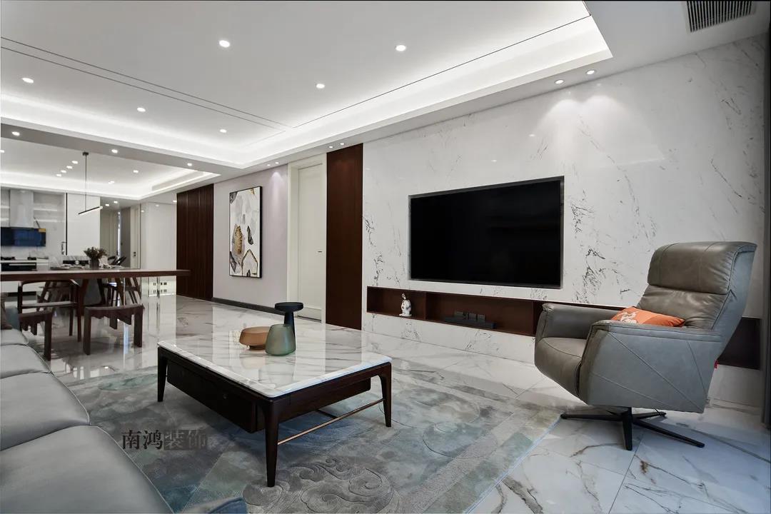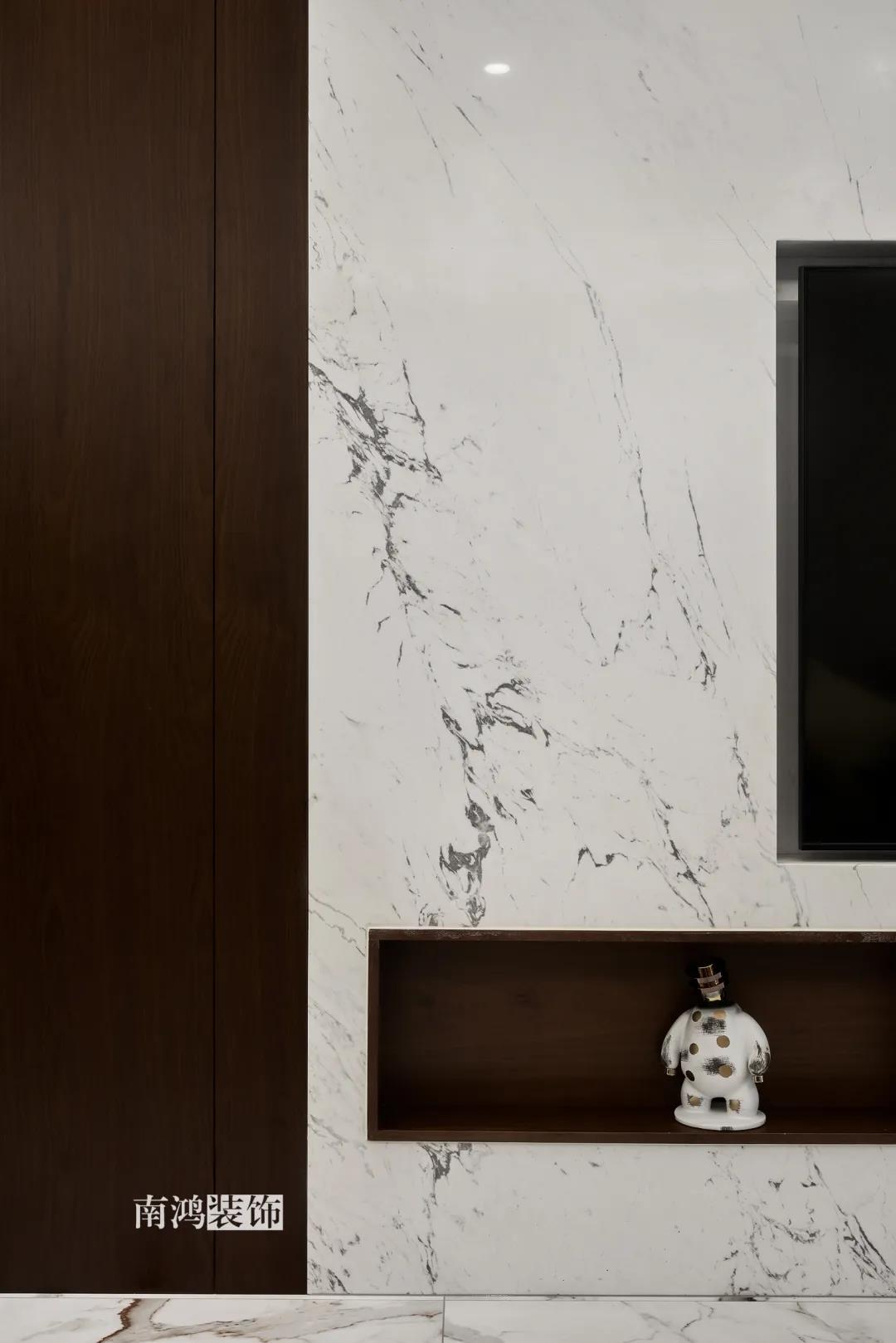 電視機嵌入大理石背景,墻面紋理與地呼應,下開收納格取代傳統電視柜的位置,立面干凈,層次更在一深一淺中凸顯。