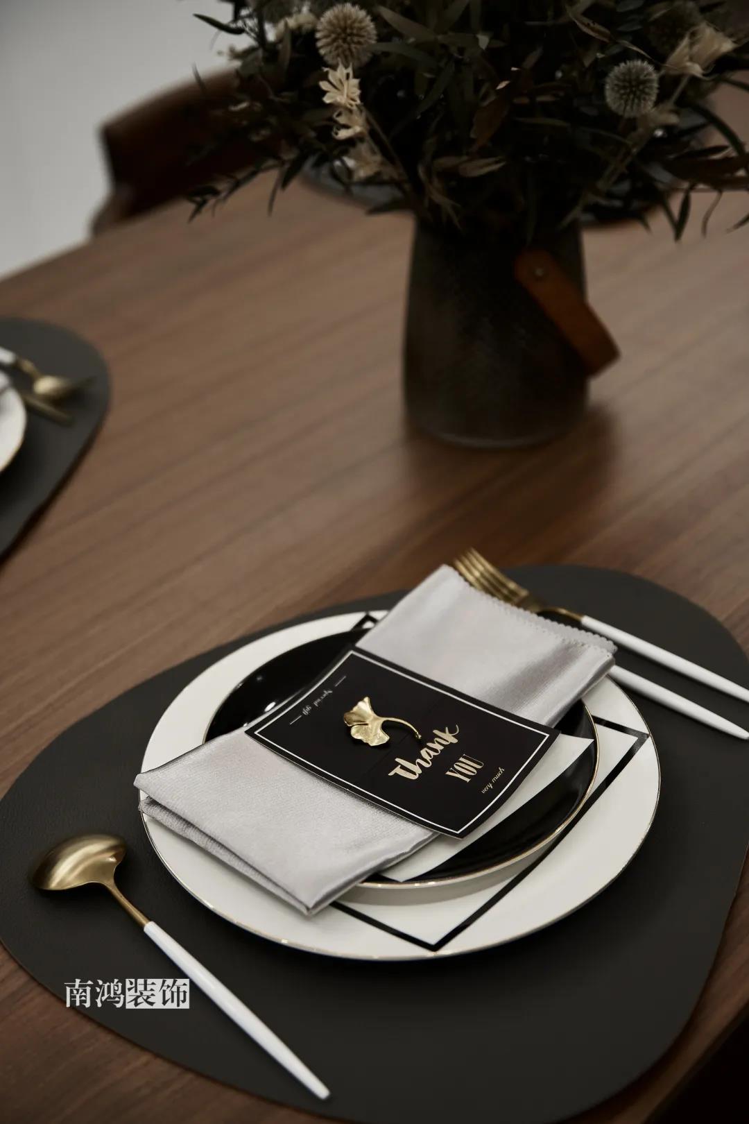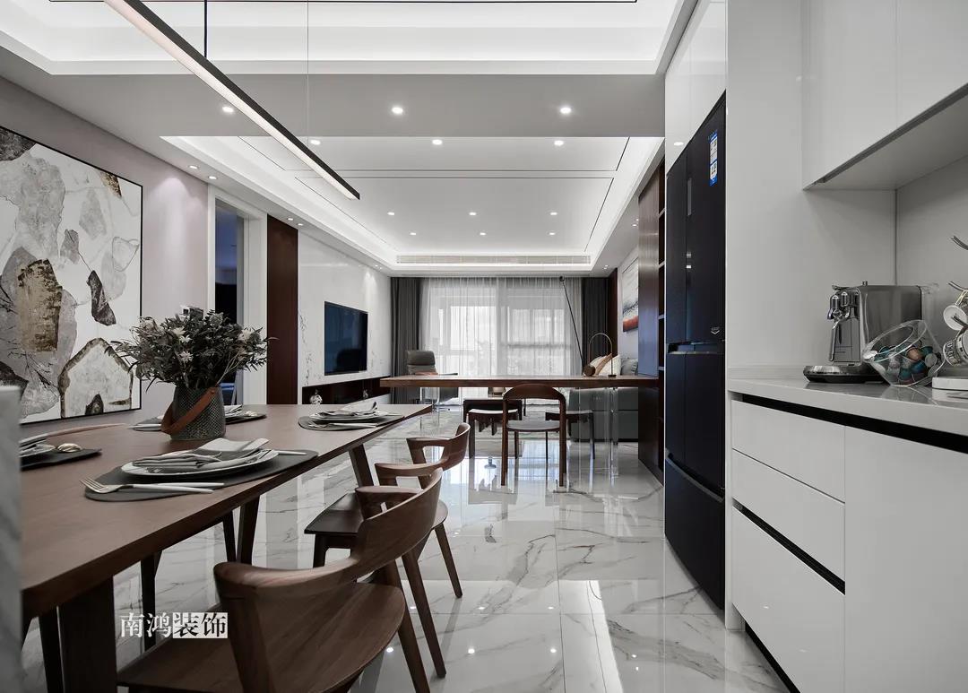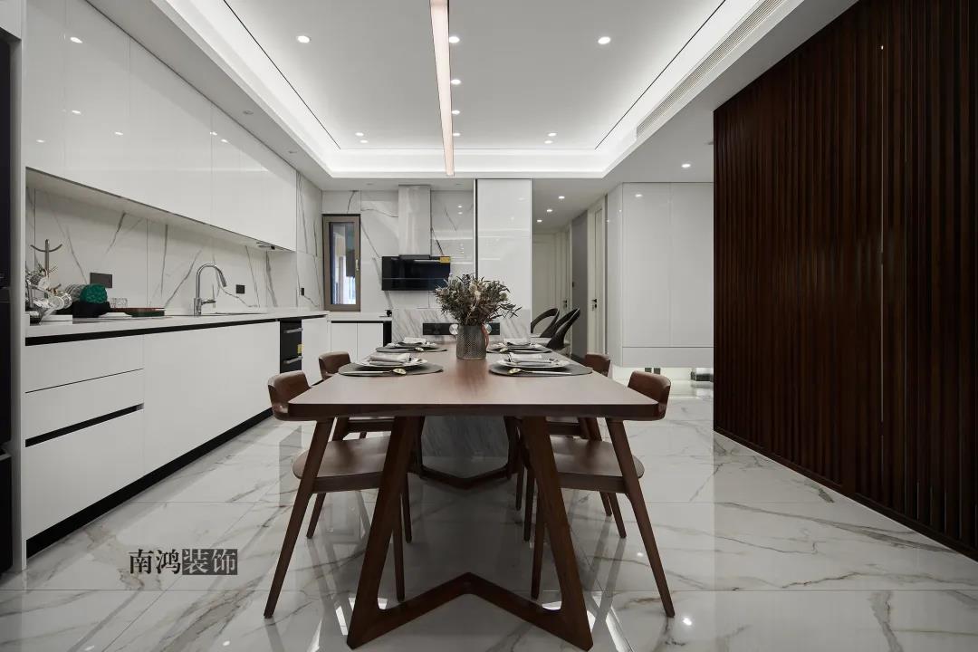 餐廳與門廳相鄰,開放式餐廚設計滿足主人的所有美好想象。餐桌的胡桃木色與島臺、廚房的淺色形成對比,雅致的古韻與鋒利的現代感交匯,成為這個家個性的一面展示。