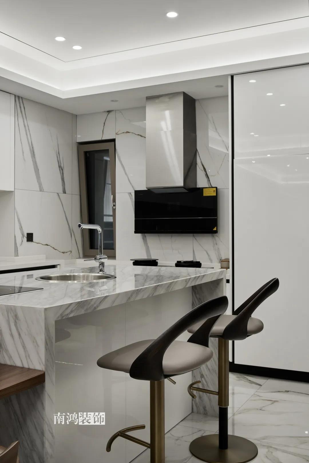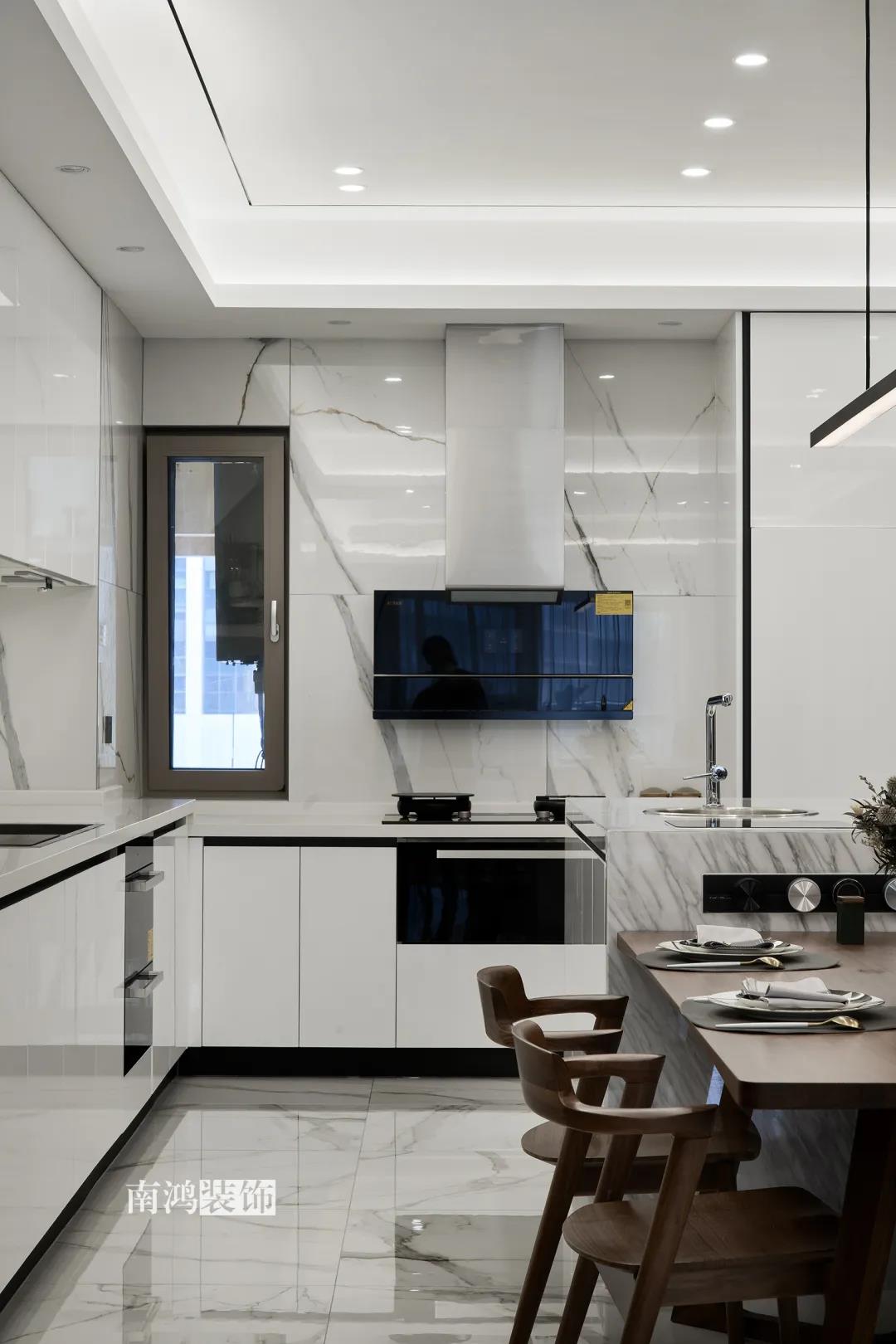 開放式布局將廚房和餐廳融為一體,潔白柜體把嵌入式電器隱含其中,寬大的臺面足以滿足日常烹飪需求,環形的動線則可以讓人穿梭其中行走自如。