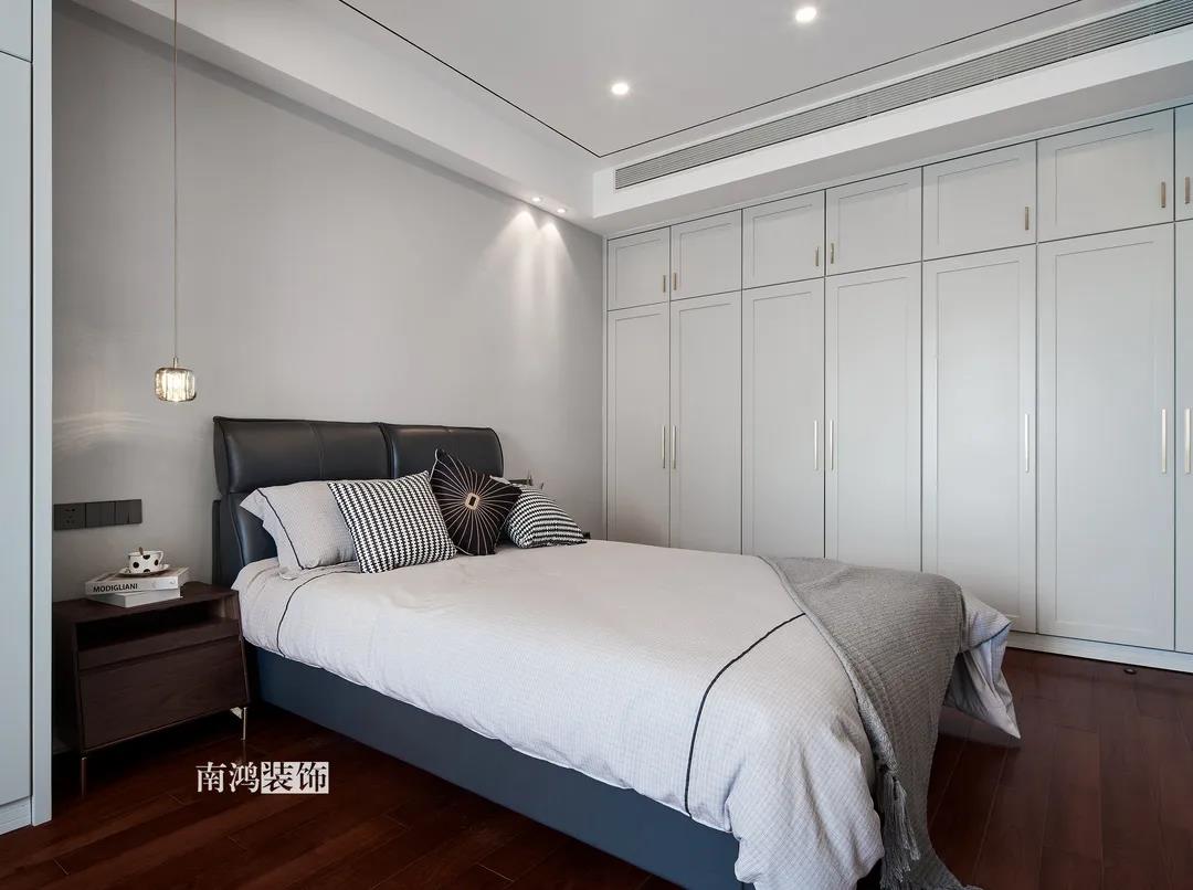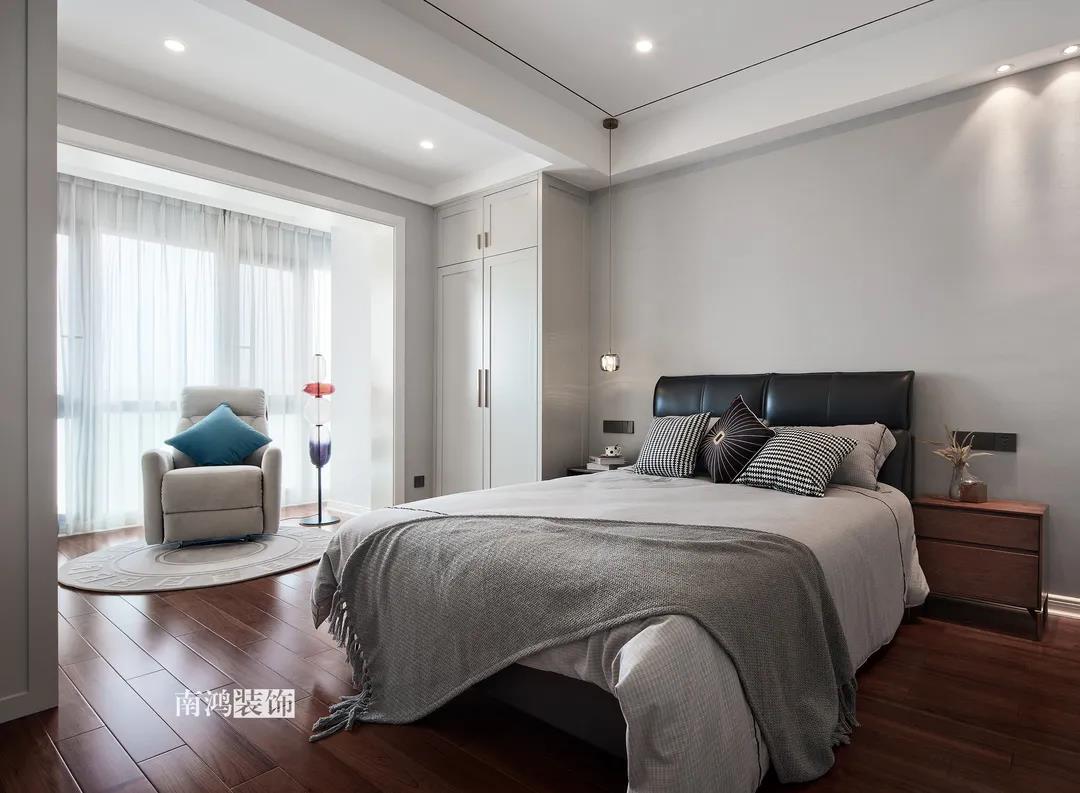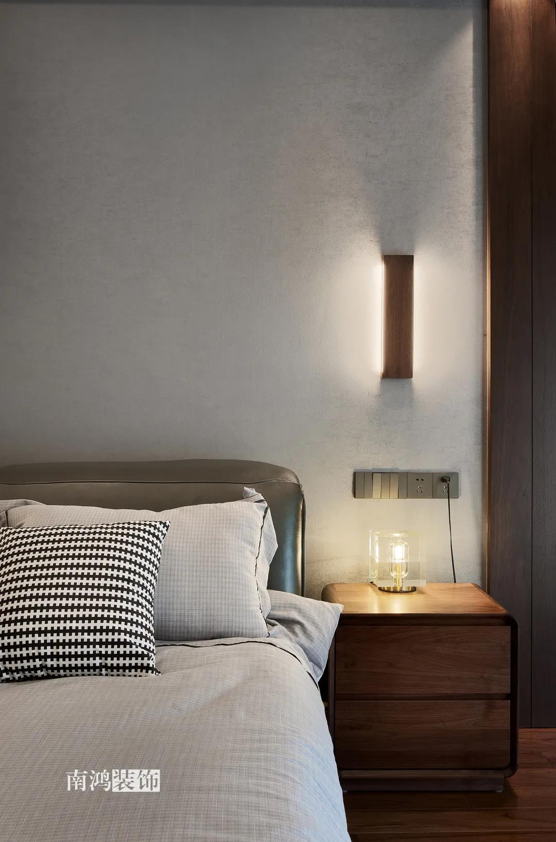主臥背景墻以灰色墻布和木飾面結合,細膩紋理展現有機的溫暖、純凈,燈光被有序在墻頂面安置,讓人倍感安神,又不失高雅格調。