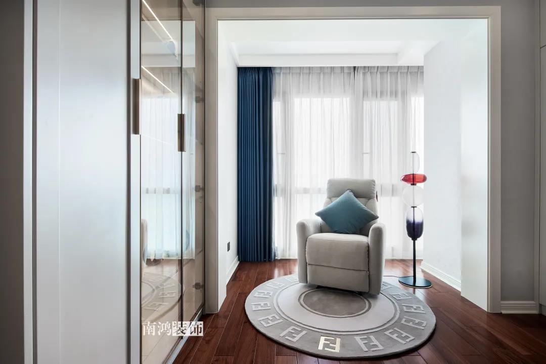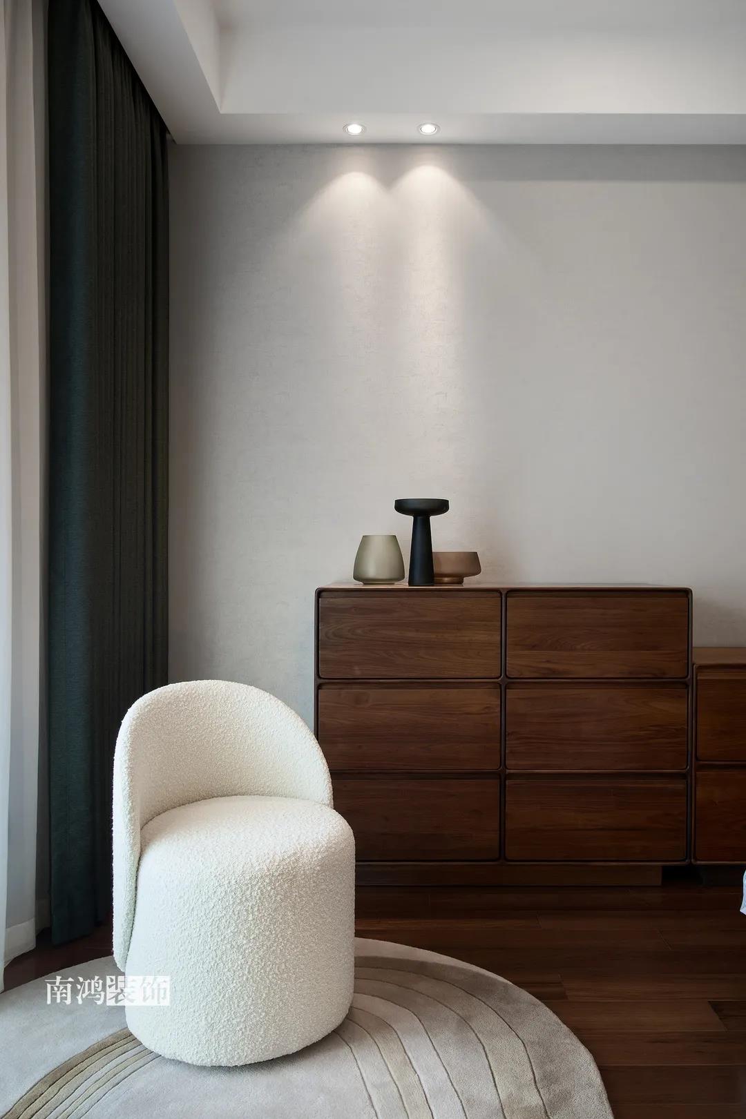 床頭壁燈的瑩瑩微光,帶來夜的凝思。床尾放一把小羊羔絨椅,圓潤線條惹人喜愛。光影之間,居室氣質自顯。