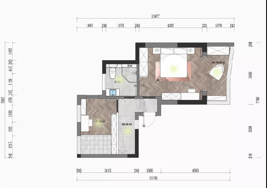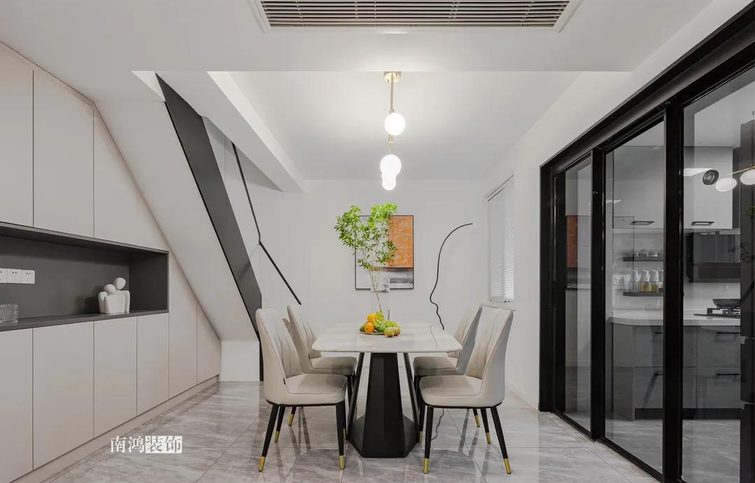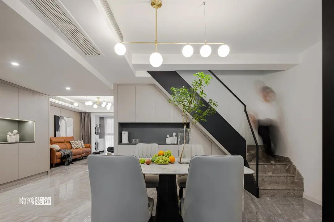 本案是一套現(xiàn)代輕奢風(fēng)格的復(fù)式作品,業(yè)主夫妻二人,暫無小孩子,房間上除主臥之外,保留了兩個次臥做父母房和兒童房,一樓寬敞通透的開放式公區(qū)域設(shè)計成為本案一大亮點。 一層集合了日常所有的的煙火氣,蒸箱、烤箱、咖啡機、洗碗機、洗衣機...攜帶著一種隨性的自由,廚房到客廳依次構(gòu)成白與黑、疏與密、放與收的過渡對比,層次感的疊加形成舒適的視覺體驗。 空間以暖調(diào)的木飾面色搭配黑白灰作為整體基調(diào),簡約利落又不失家的溫馨。 戶型分析 ▼ 原始戶型存在一樓空間相對擁擠,樓梯陡峭,走起來費力,二樓空間利用率不高等問題。 1、樓梯位置調(diào)整,打造多個收納展示空間。 2、原有結(jié)構(gòu)陽臺納入室內(nèi),擴大客廳使用面積和直接采光面。 3、廚房門洞改變方向,消除了原廚房與客餐廳的隔閡,打造一體化、全開放的格 局。 入戶區(qū)迎面而來一層開放大格局,往左為客廳,視野通透舒暢。定制儲物柜滿足基本的收納需求,色彩由淺入深,層次清晰分明,滿足功能的同時不失視覺美感。 青草綠點綴出小清新,柜內(nèi)設(shè)計隱藏式燈帶,見光不見燈的效果,簡單一筆勾勒出空間輪廓與光影質(zhì)感。 客 廳 LIVING ROOM 美觀大方的客廳空間,左右兩側(cè)維系著剛剛好的距離,溫和的底色在視覺上減輕了壓迫感。大理石與木飾面結(jié)合的電視背景,搭配硬包,皮藝沙發(fā)和單椅,顯出輕奢意味。 黑白灰三色搭配的餐廳空間,點綴的金屬材質(zhì)點亮活力。開敞明亮的用餐環(huán)境,兩側(cè)都留有足夠大的通道距離,應(yīng)對日常的社交聚餐可以說毫無壓力。 空間的時尚高級感,除了整體硬裝、家具的造型選擇之外,更重要在于細(xì)節(jié)的雕琢。由樓梯下來的白凈墻面,除了懸掛常規(guī)的裝飾畫外,由黑色線條勾勒的人像圖形也頗有趣味,讓人能感受到一種自在而愉悅的氛圍。 灰色向來是現(xiàn)代感家居的寵兒,沉靜色彩更能凸顯質(zhì)感。 廚 房 KITCHEN 廚房與餐廳以玻璃門相隔,保持視覺的通暢,U型設(shè)計極大地提高空間利用率,洗菜、切菜、烹炒動線流暢,高效下廚輕輕松松。 主臥包入陽臺打造為休閑區(qū),床頭背景清新的淺藍(lán)色與床品的灰色、單椅的橙色形成了具有層次感的溫馨格調(diào)。 床尾打造女主人的梳妝臺,豎線條裝飾營造縱橫維度的立體感,與留白的墻面相映襯,豐富了主臥空間的現(xiàn)代意象。 休閑陽臺除了一把單椅外,還有造型輕巧的穿衣鏡與掛衣架,生活的小確幸就在一點一滴的細(xì)節(jié)間把握。 長輩房藏在客廳隱形門背后,不增添過多修飾的空間更加簡約耐看,偶爾來小住的父母也有了私密的休憩之地。 長虹玻璃門引入外部光線,保證衛(wèi)浴室的明凈感受。壁掛馬桶不留衛(wèi)生死角,方便日常清潔。黑色的五金件隱隱占據(jù)視覺主導(dǎo),將利落的現(xiàn)代感盡可能放大。
